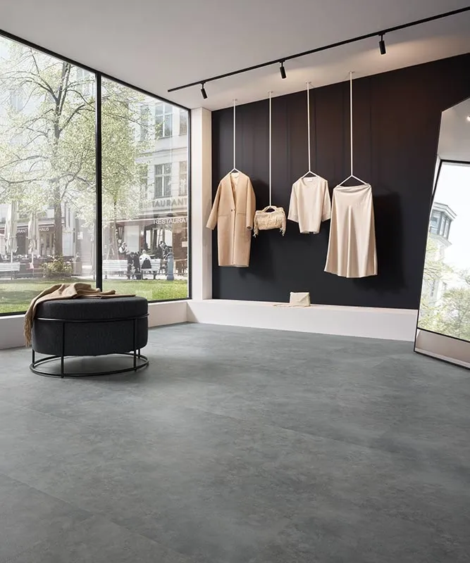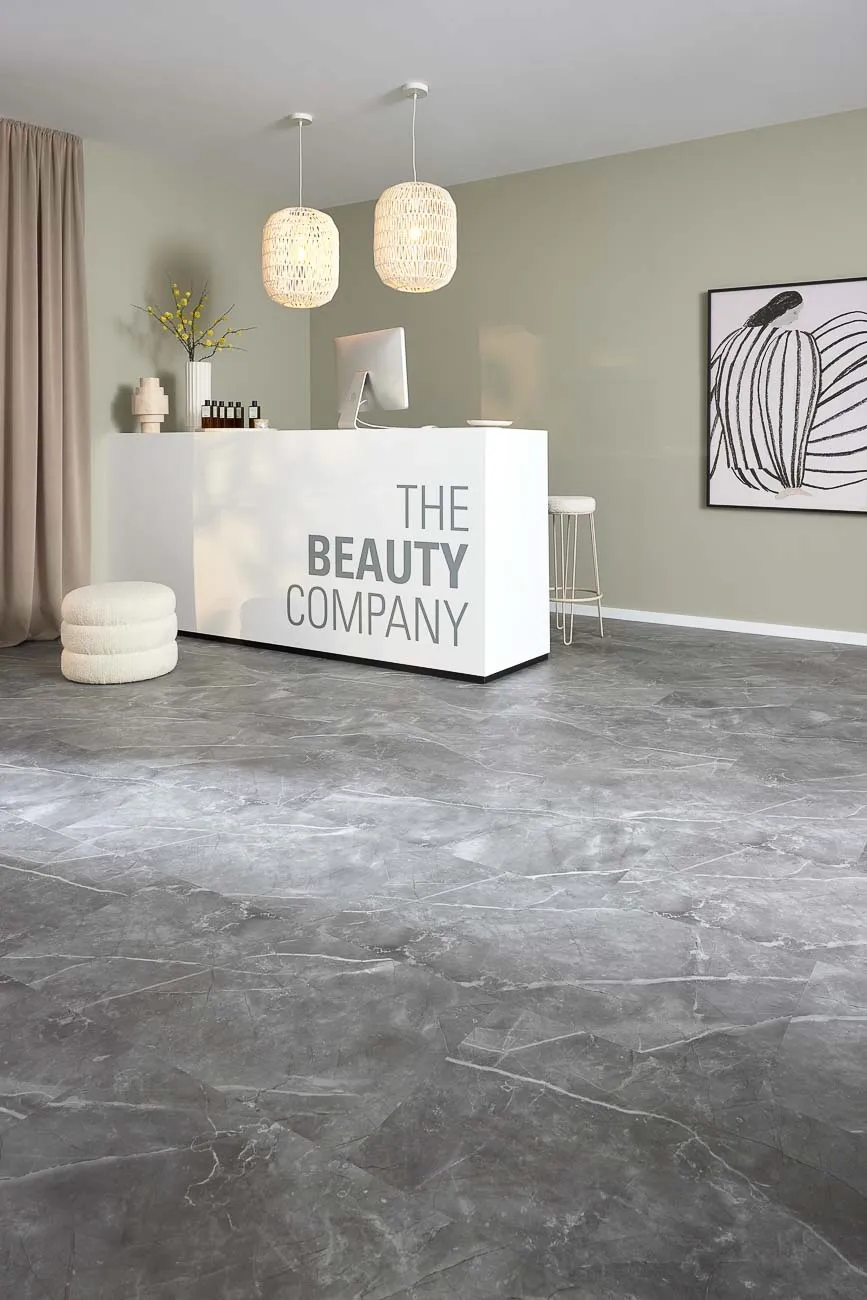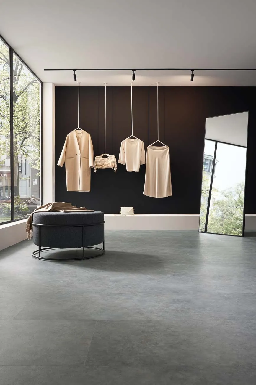 Designboden zum Kleben mit nur 2,5 mm Aufbauhöhe: Ideal für Feuchträume wie Küche und Bad. Wasserbeständig und nahtlose Verlegung auf großen Flächen – für ein harmonisches Gesamtbild ohne Dehnungsfuge und hohe Anforderungen an Langlebigkeit und Stabilität.