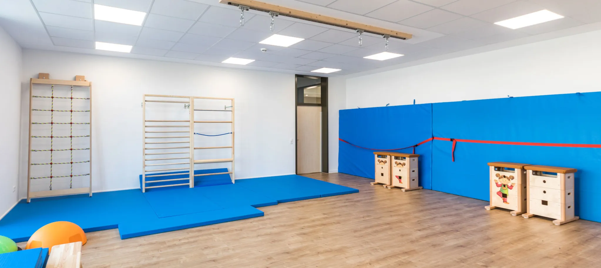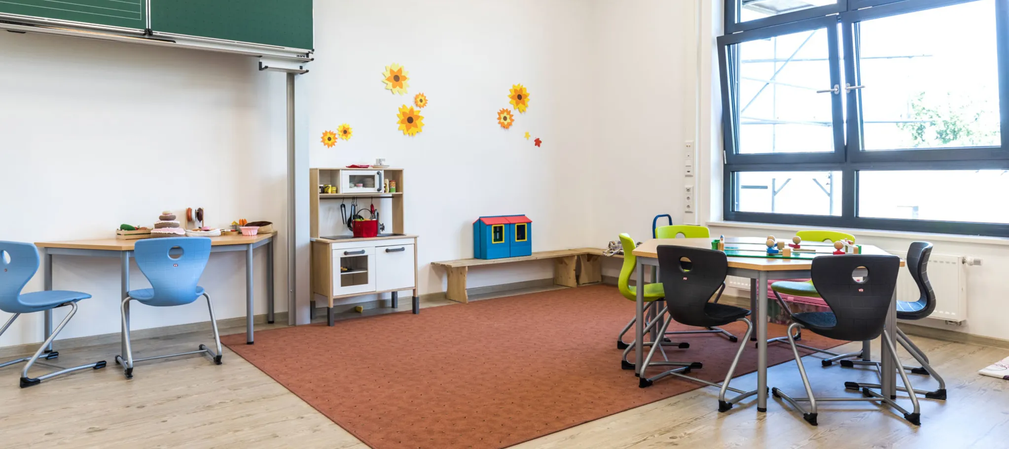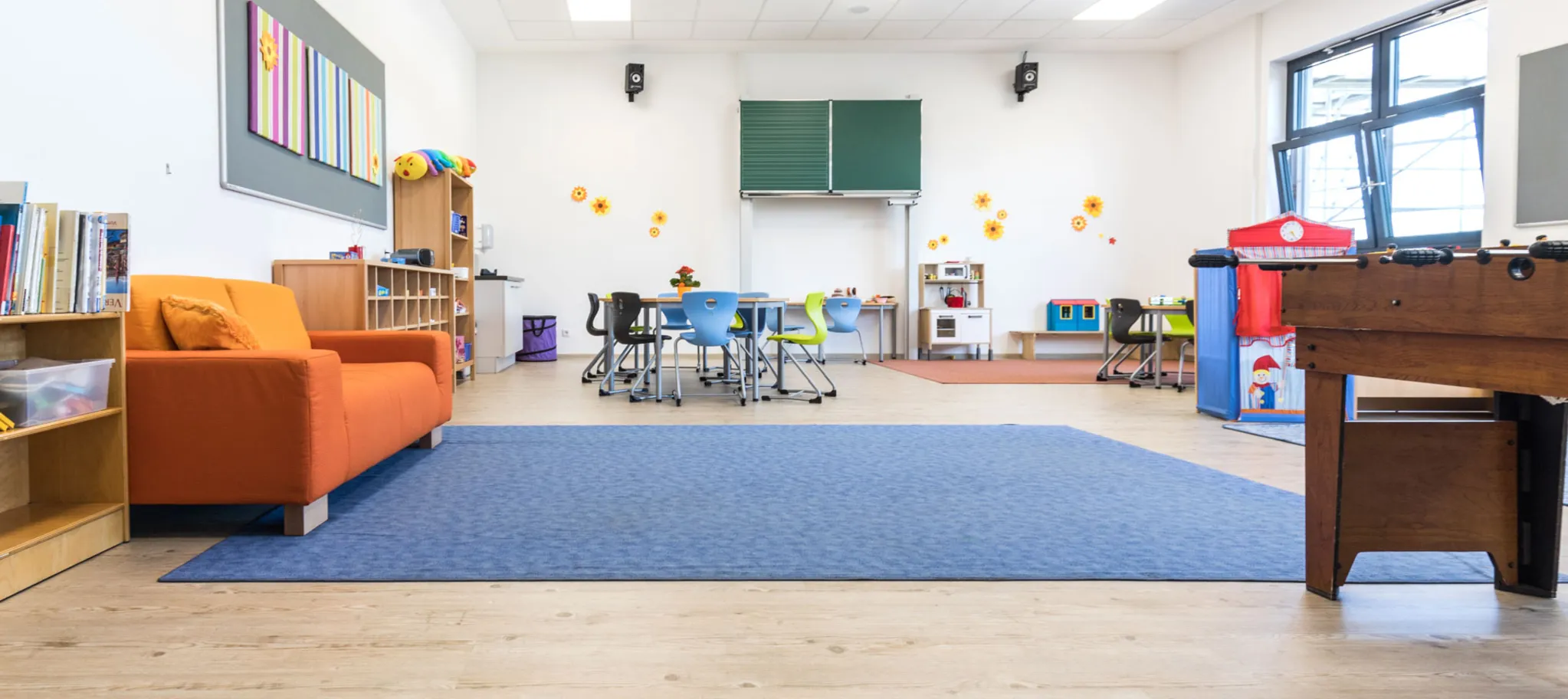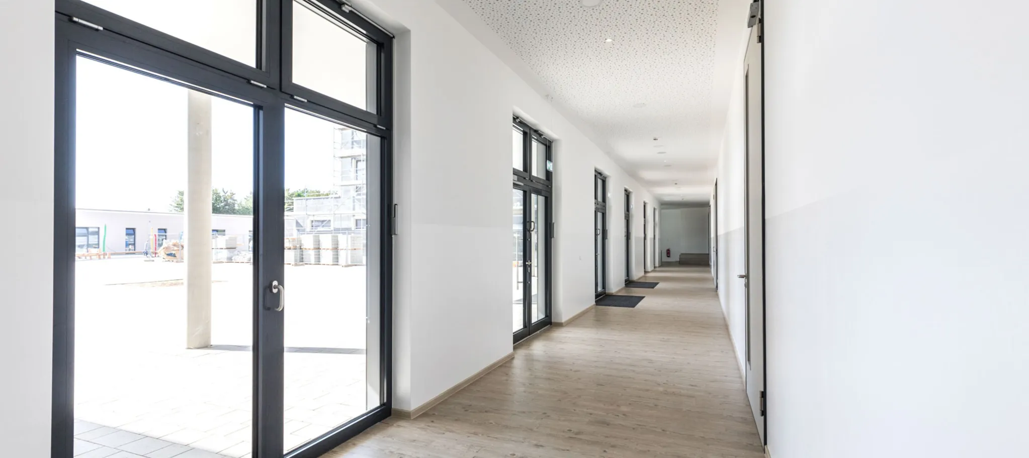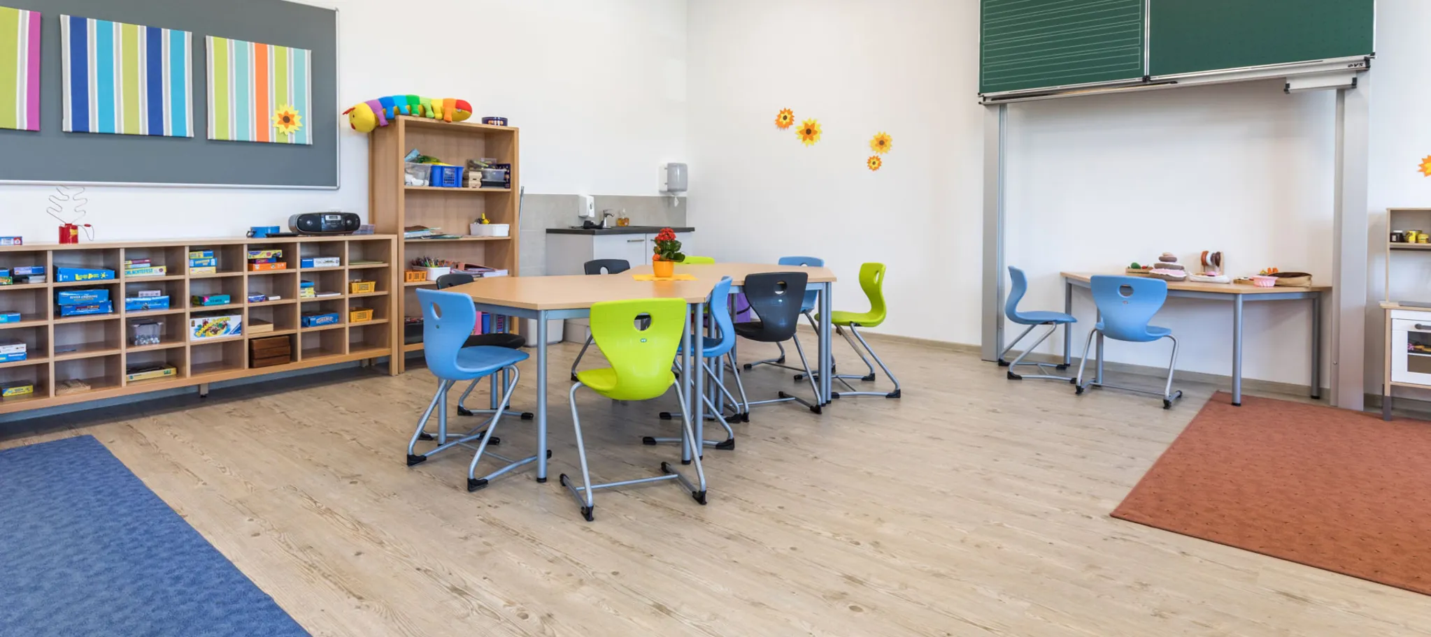 Auf knapp 5.000 Quadratmetern wurde der PURLINE Bioboden wineo 1500 wood XL im Sonderdekor Ascona Pine Nature verlegt. Dieser helle Farbton ist in den 16 Klassenzimmern sowie in Verwaltung, Fluren und Aula zu finden. Der honiggelbe Farbton Canyon Oak Honey fand auf etwa 1.000 Quadratmetern in den Spiel- und Turnräumen Verwendung. In weiteren Bereichen kam die dunkelbraune Variante Village Oak Brown zum Einsatz.