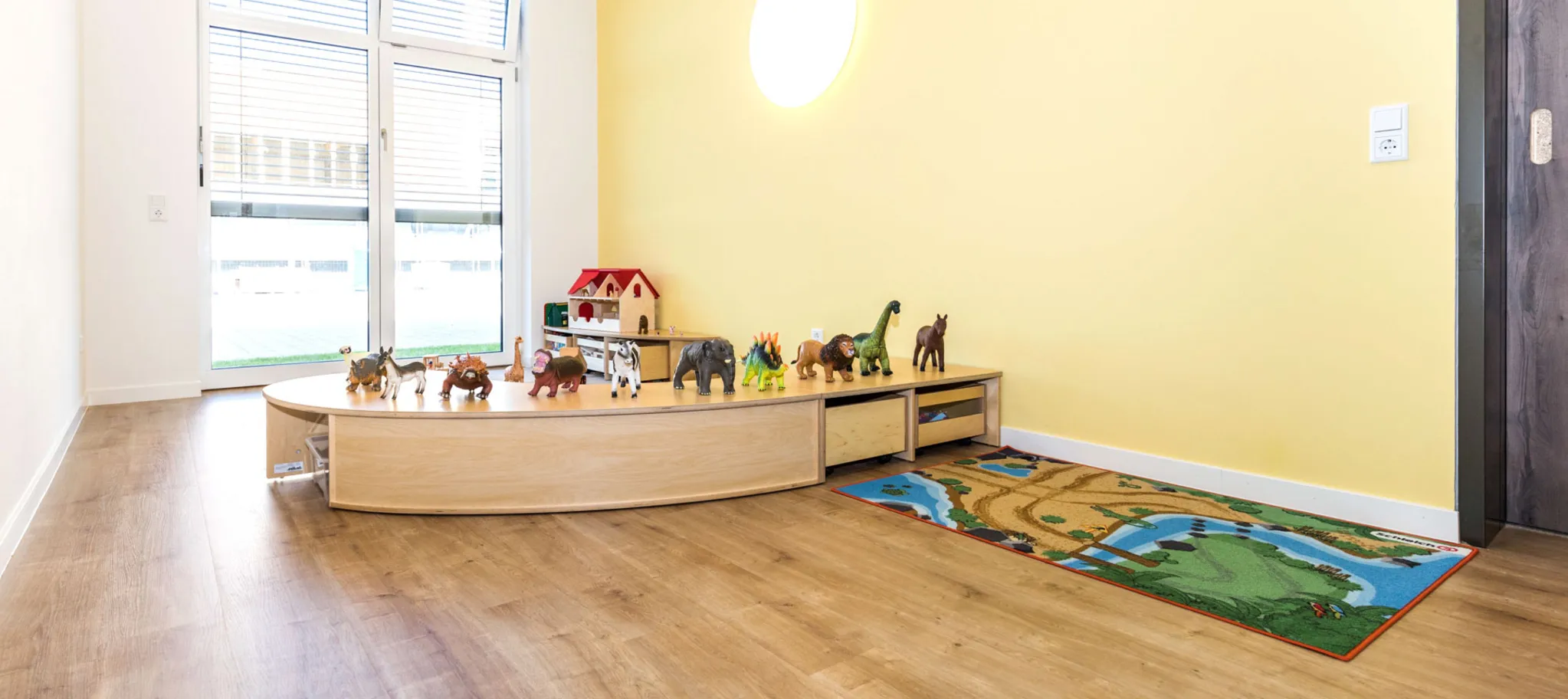 Von der Optik wirkt PURLINE Bioboden wie natürlich gewachsenes Holz. Das Ausgangsmaterial ist der Verbundwerkstoff ecuran. Er bietet alle Vorzüge dauerelastischer Böden, besteht aber zu einem überwiegenden Teil aus Pflanzenölen wie Raps- oder Rizinusöl und natürlich vorkommenden mineralischen Komponenten wie Kreide – ohne Zusatz von Chlor, Weichmachern und Lösungsmitteln. Kinder können auf diesem Belag rennen und toben, ohne nennenswerte Spuren zu hinterlassen. Auch mit Blick auf Geh- und Trittschallwerte schneidet das Material gut ab. Mit der Rutschhemmstufe R10 minimiert der Boden zudem die Gefahr, dass Kinder stürzen und sich verletzen.