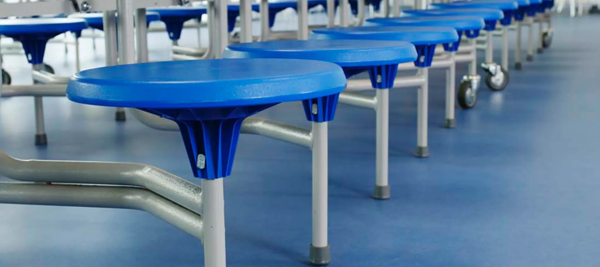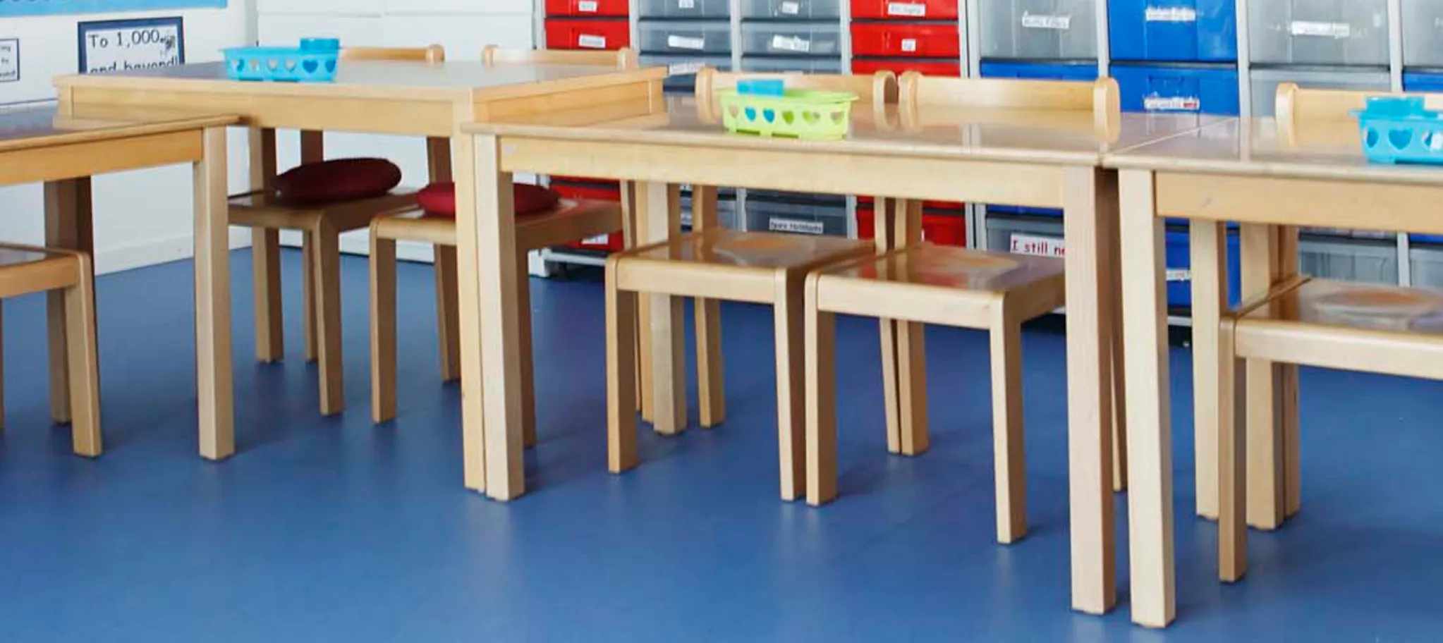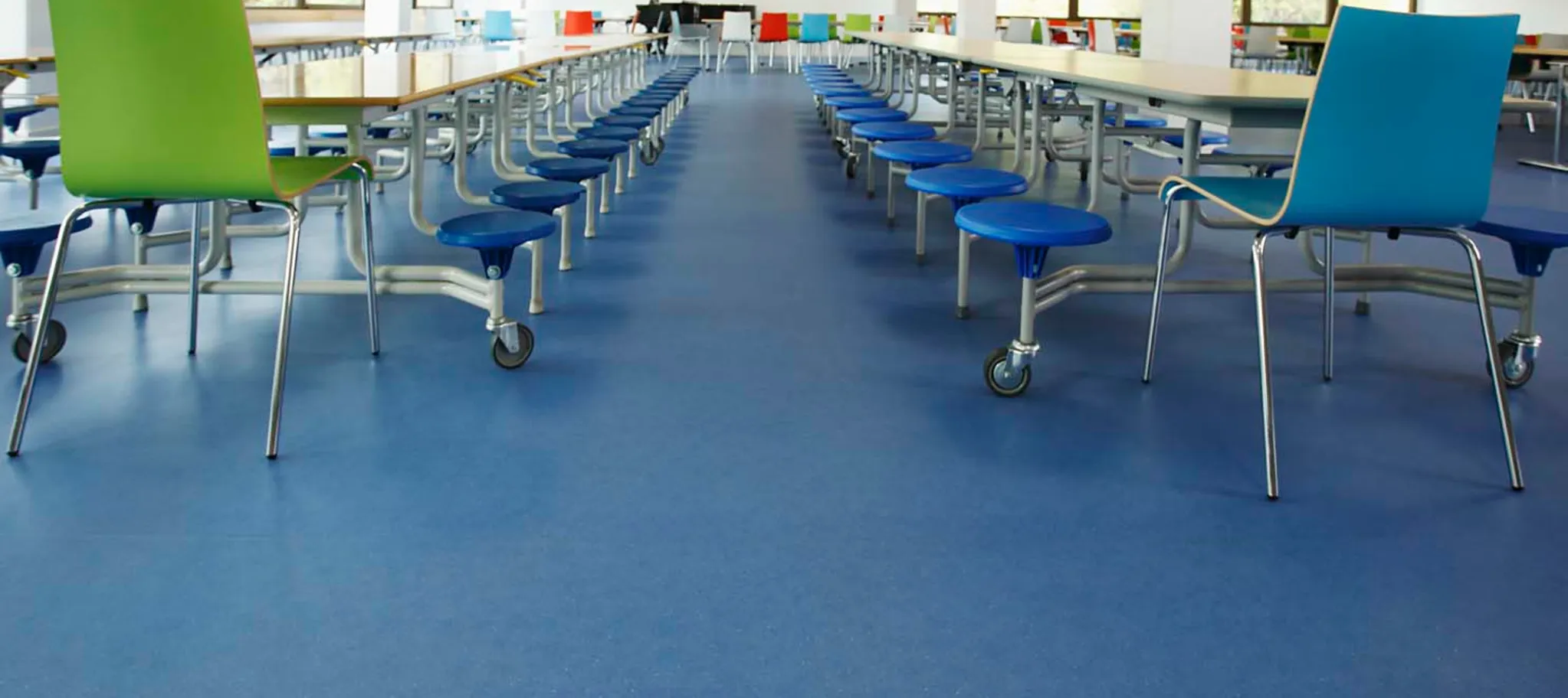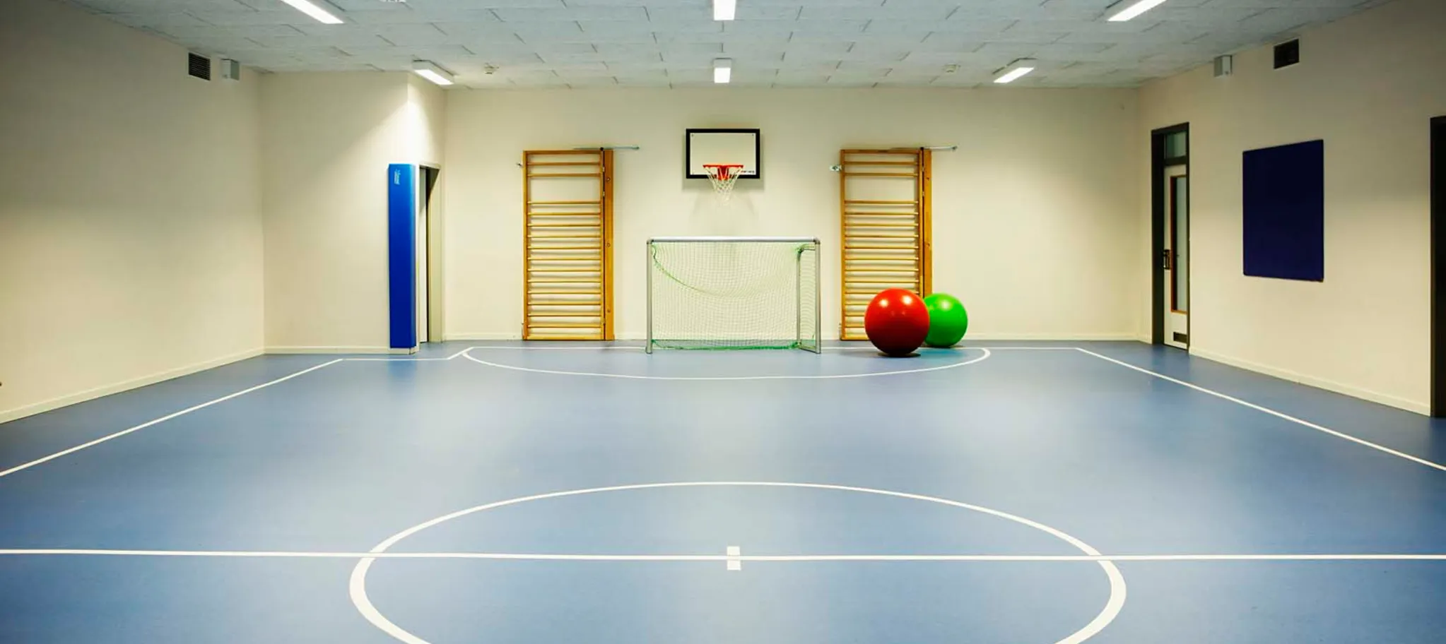 Ausgewählt wurden Designs verschiedene Sonderdekore gewählt: Für die Mensa kam das dunkelblaue, leicht gechippte Design Blue Lagoon zum Einsatz, für die Kita das Holzdesign im warmen Pacific Oak kombiniert mit dem hellblauen Design Summer Sky. Der Turnhallenbereich wurde mit der hellblauen Summer Sky ausgestattet und mit weißer Spielfeldmarkierung versehen. Da im Bereich der Turnhalle höhere Trittschalldämmwerte erfüllt werden mussten, wurde PURLINE auf der ebenfalls überwiegend aus nachwachsenden Rohstoffen hergestellten 2 mm Akustikmatte soundPROTECT Eco Plus des Herstellers verlegt. Damit können die Trittschall-Werte bis ca. >19 dB (Dezibel) und der Gehschall um ca. 28 Prozent reduziert werden.