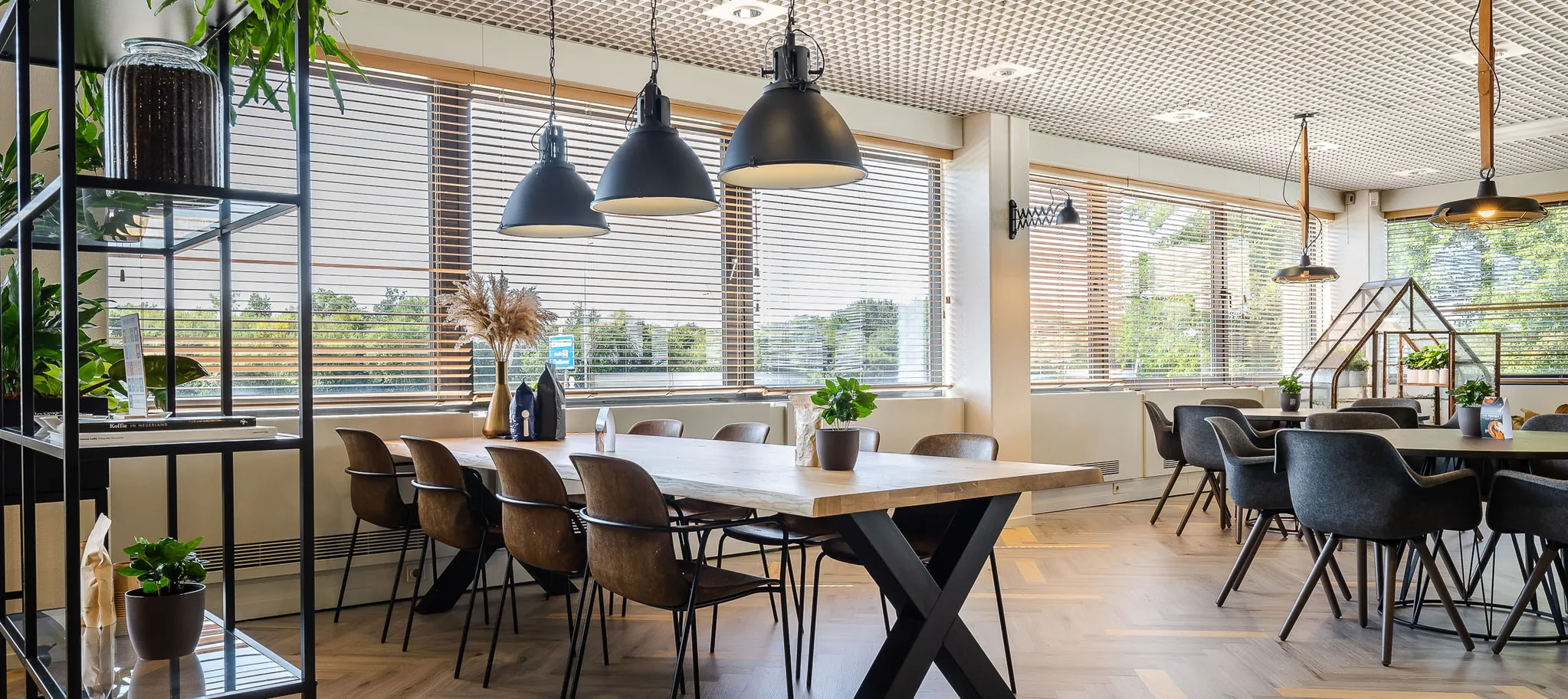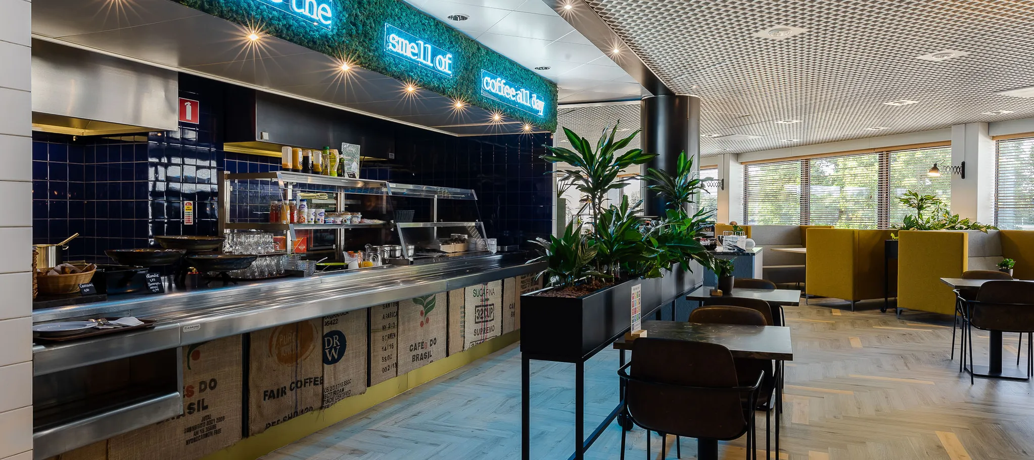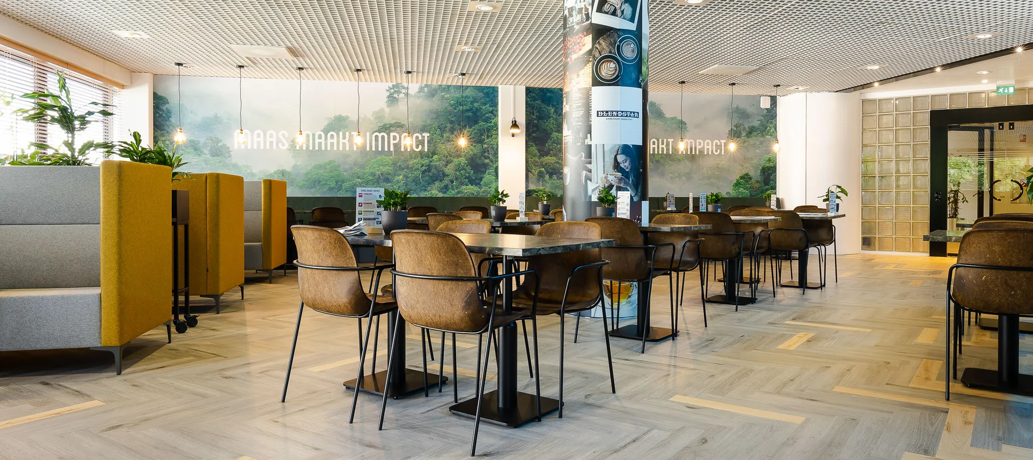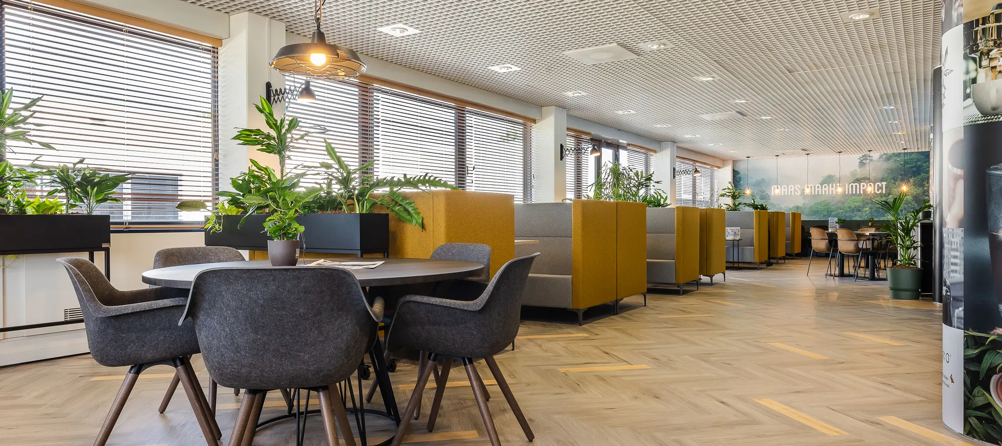 Dieses Projekt befindet sich in Eindhoven und das Unternehmen heißt Maas International. MAAS verkaufen Kaffee, Tee und Geräte (Maschinen) an andere Unternehmen. Bei diesem Projekt wurde das firmeninterne Restaurant so umgestaltet, dass es auch als Arbeitsplatz für die Mitarbeiter und nicht nur während der Mittagspause genutzt wird. Ziel war es, einen zentralen Ort zu schaffen, an dem Kundentermine und Präsentationen stattfinden können, aber auch flexible Arbeitsplätze für Mitarbeiter vorhanden sind.