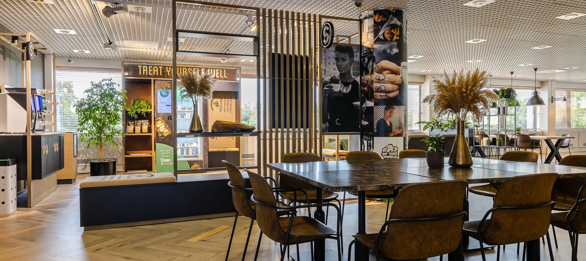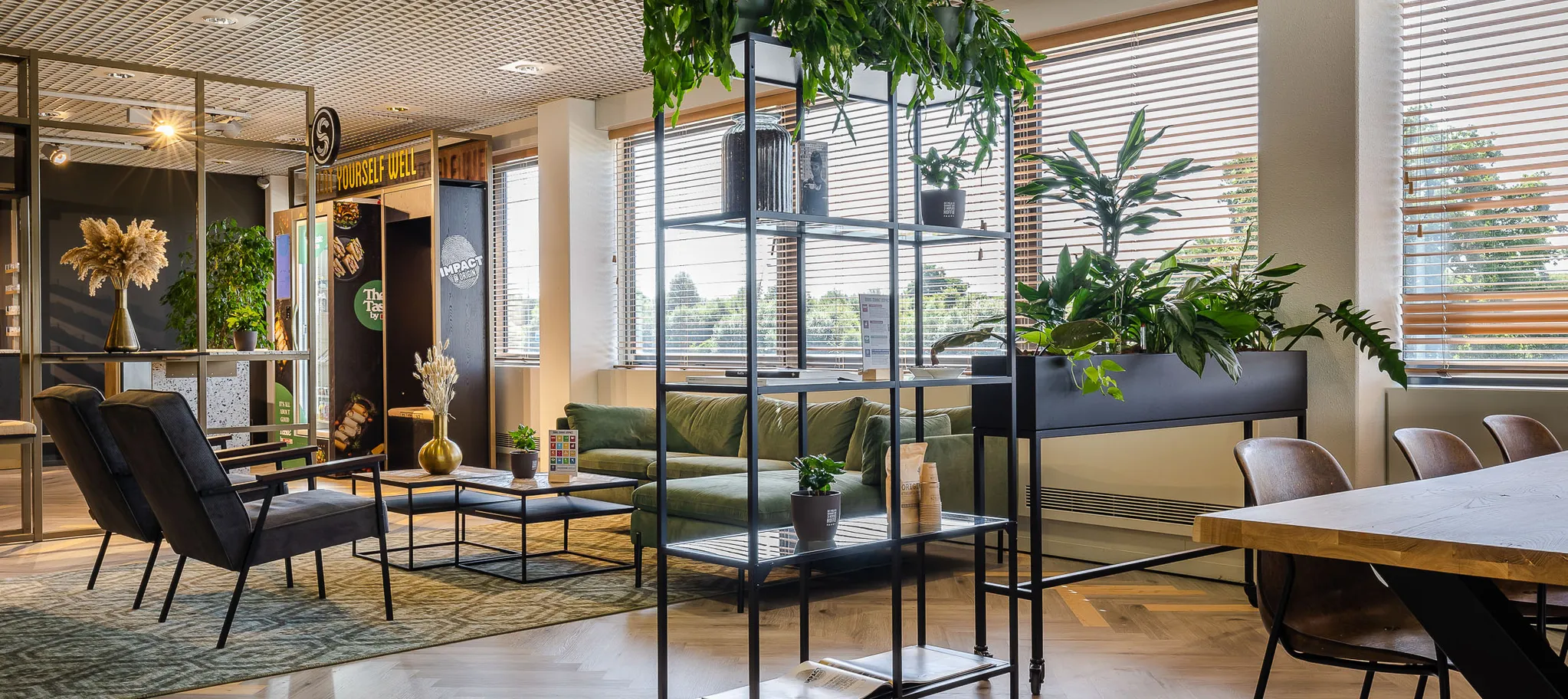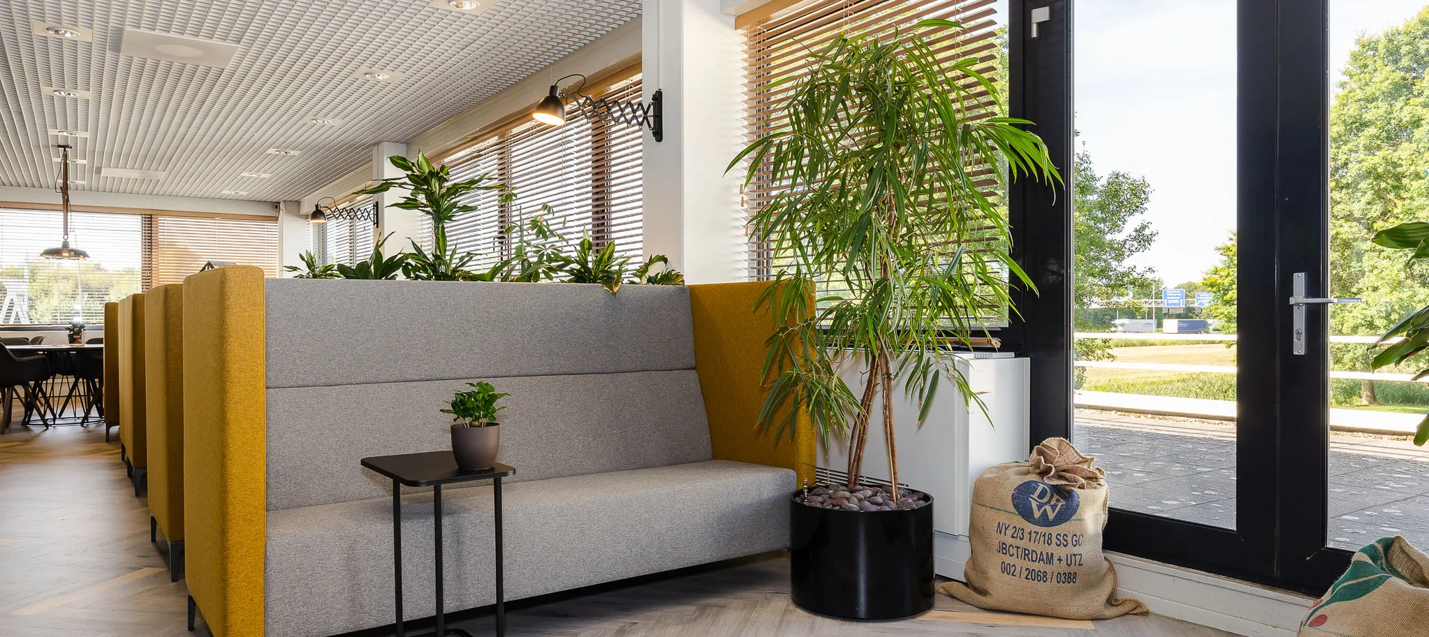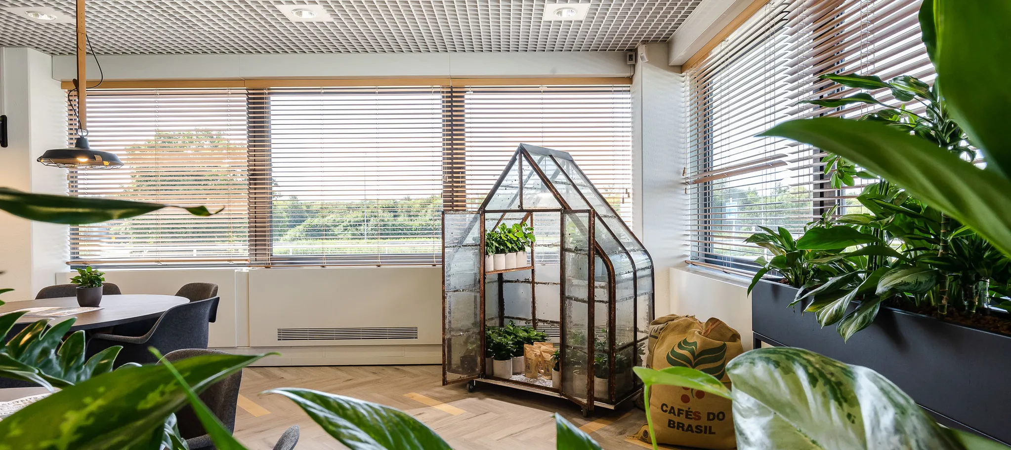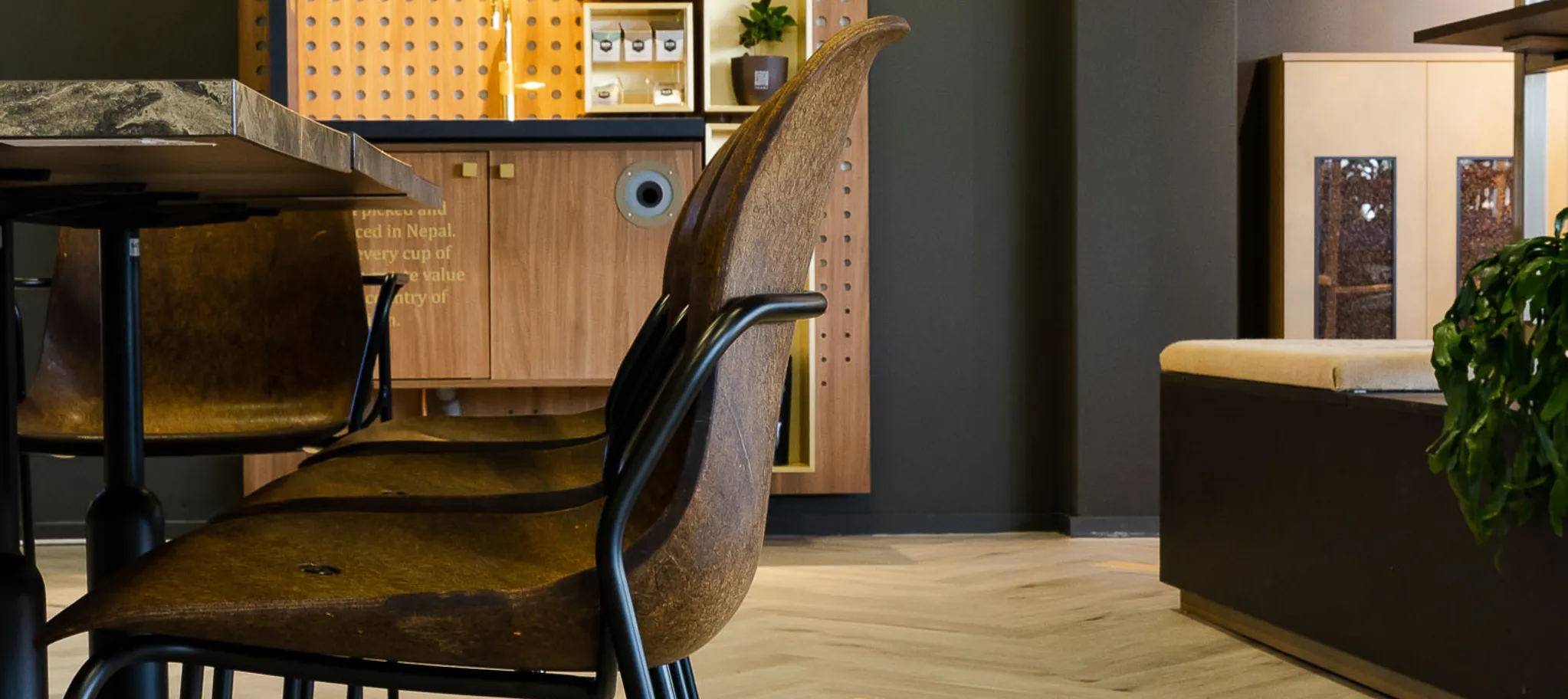 Dieses Projekt befindet sich in Eindhoven und das Unternehmen heißt Maas International. MAAS verkaufen Kaffee, Tee und Geräte (Maschinen) an andere Unternehmen. Bei diesem Projekt wurde das firmeninterne Restaurant so umgestaltet, dass es auch als Arbeitsplatz für die Mitarbeiter und nicht nur während der Mittagspause genutzt wird. Ziel war es, einen zentralen Ort zu schaffen, an dem Kundentermine und Präsentationen stattfinden können, aber auch flexible Arbeitsplätze für Mitarbeiter vorhanden sind.